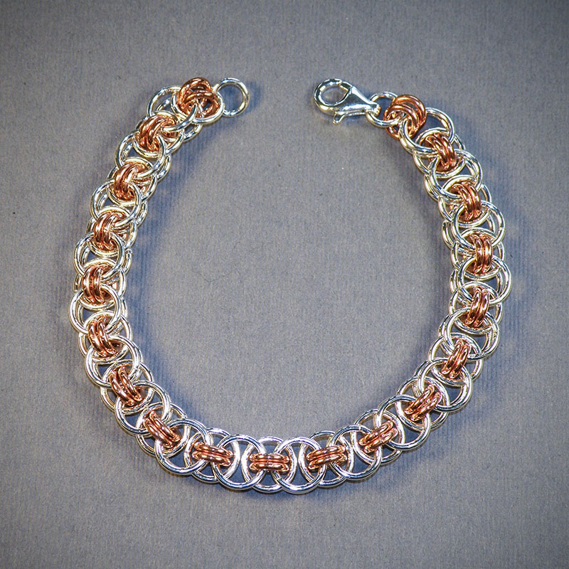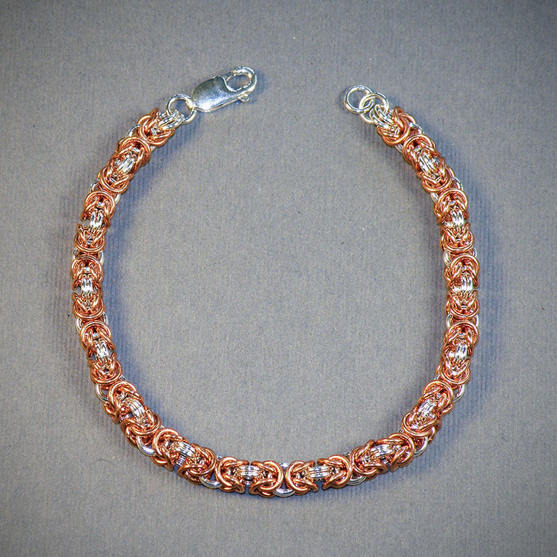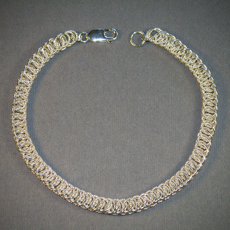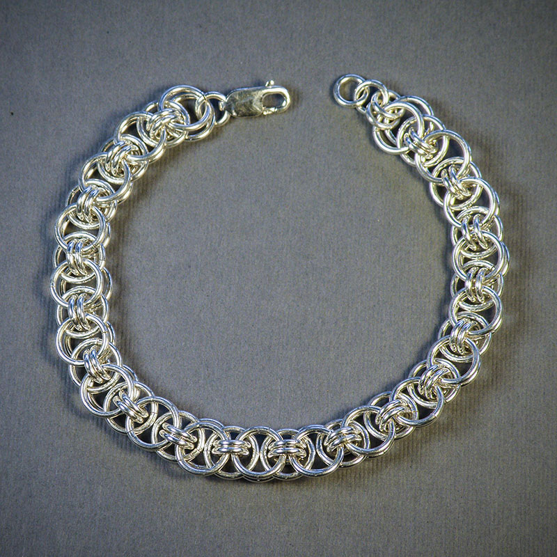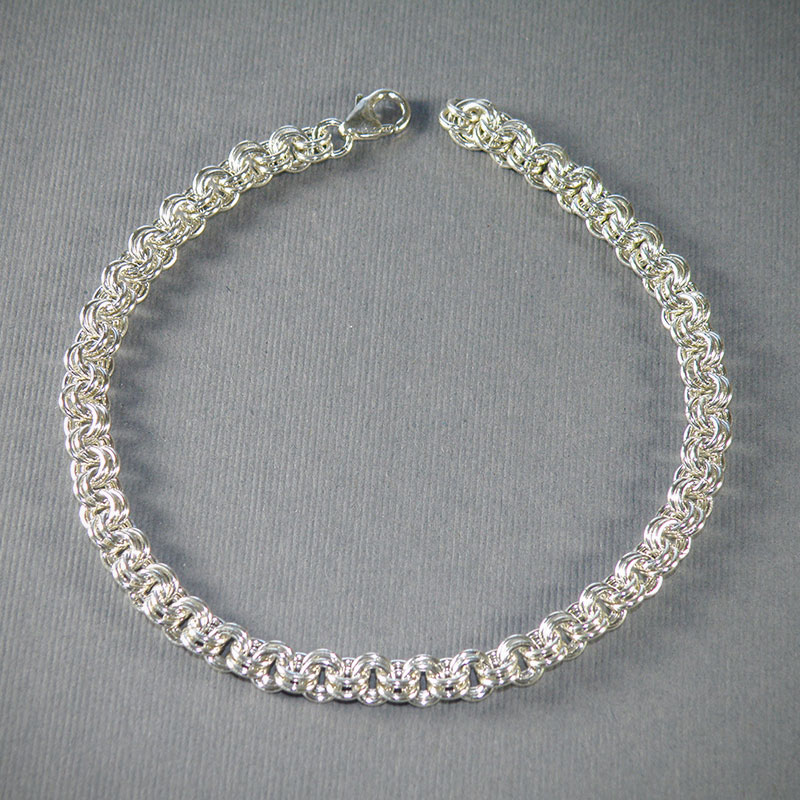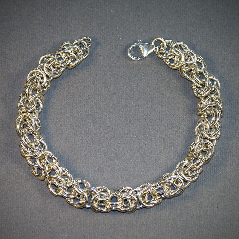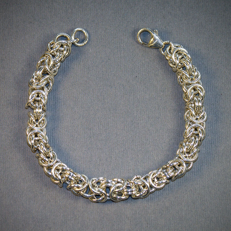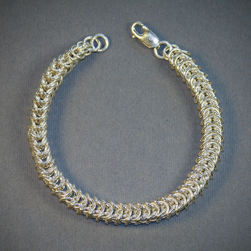 Chainmaille begins as straight wire. It is coiled over a mandrel to a specific diameter. The coils are then cut apart to create individual jump rings. These rings are then woven into a desired pattern. When the piece is finished it is then tumbled for two hours in a rock tumbler with steel shot and a burnishing compound liquid. This process both hardens the material and polishes it to a high luster finish.