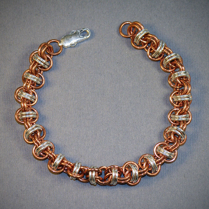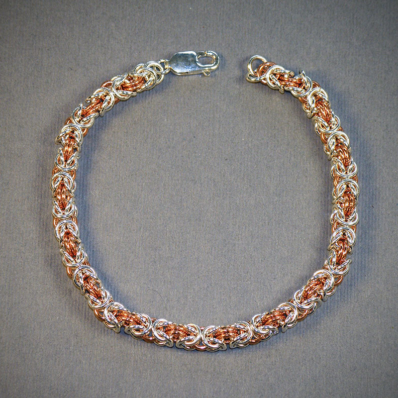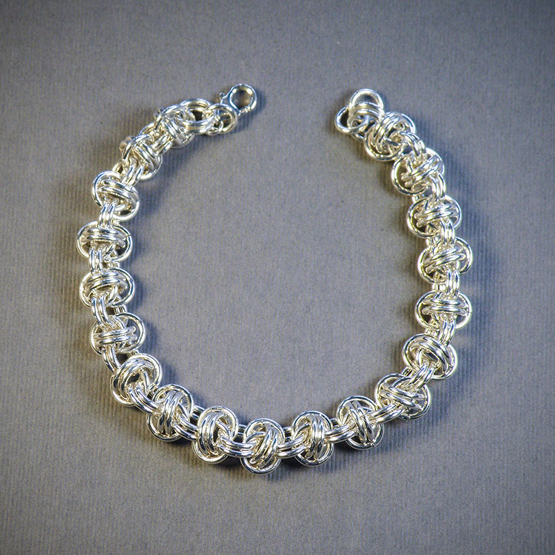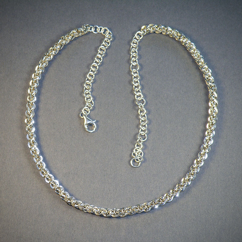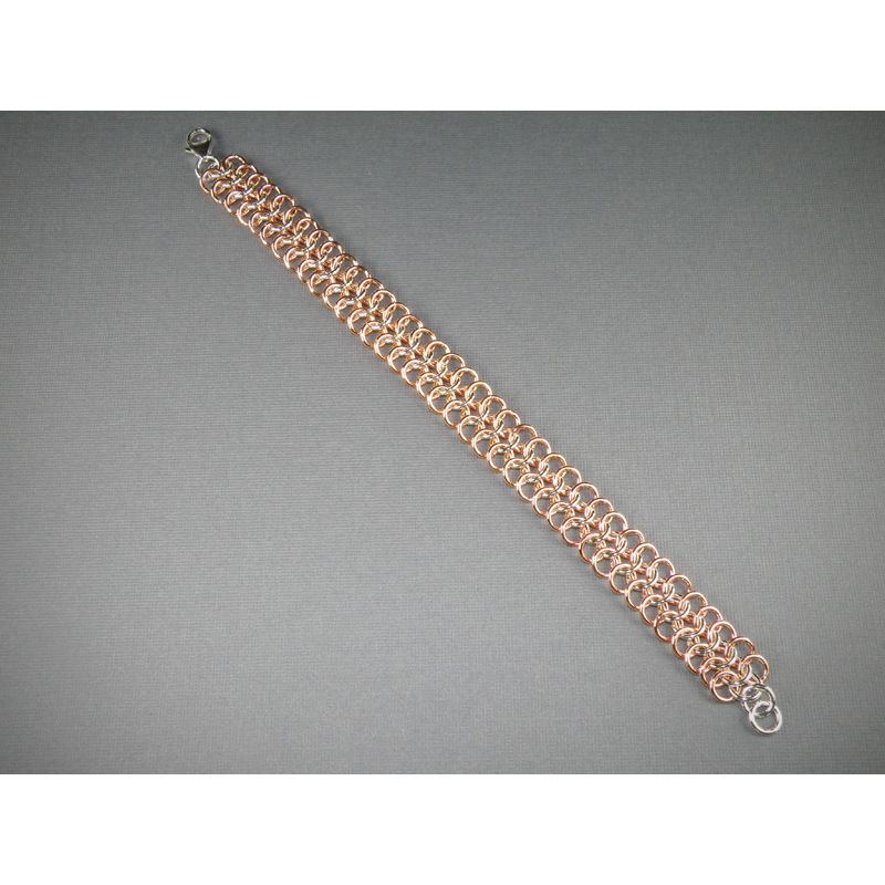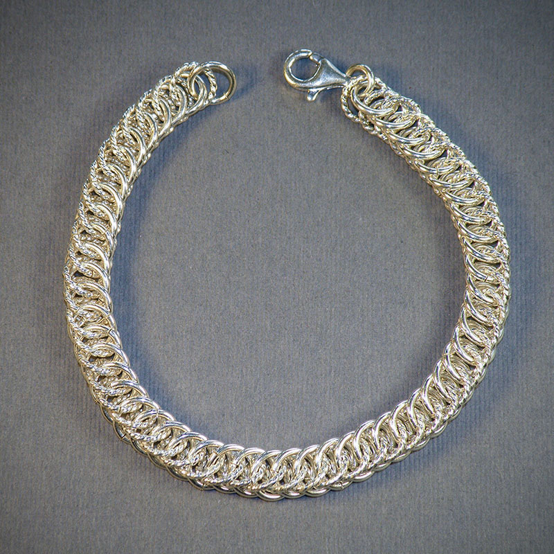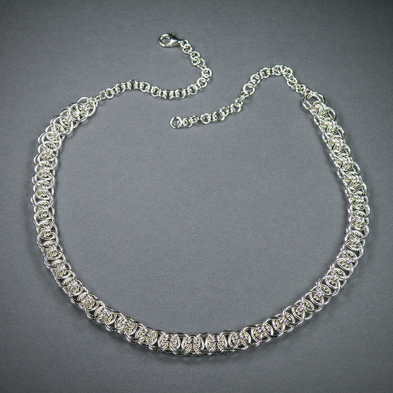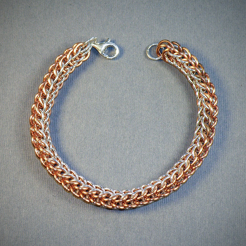 Chainmaille begins as straight wire. It is coiled over a mandrel to a specific diameter. The coils are then cut apart to create individual jump rings. These rings are then woven into a desired pattern. When the piece is finished it is then tumbled for two hours in a rock tumbler with steel shot and a burnishing compound liquid. This process both hardens the material and polishes it to a high luster finish.