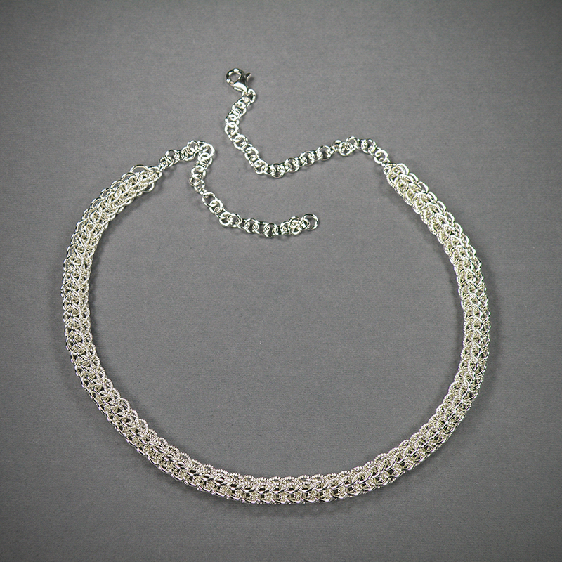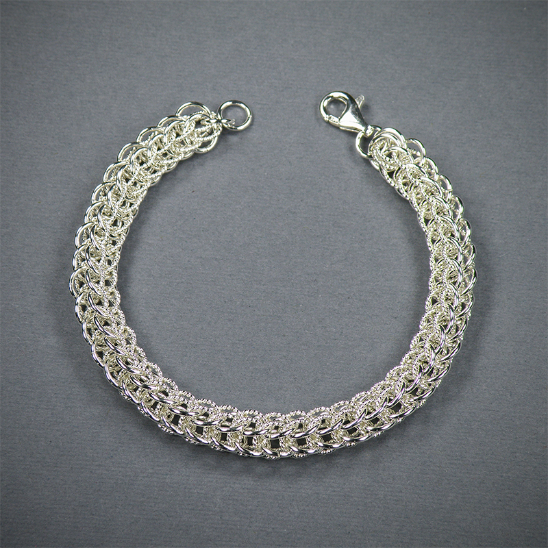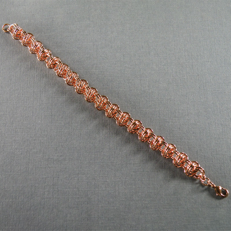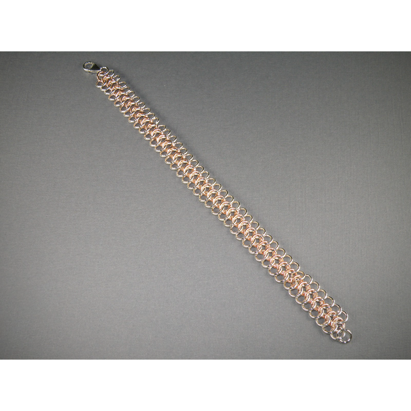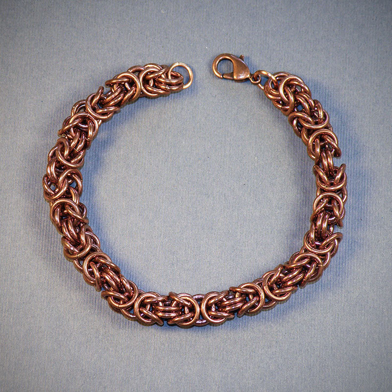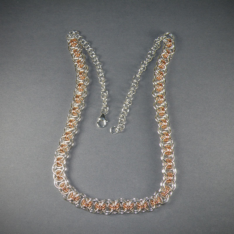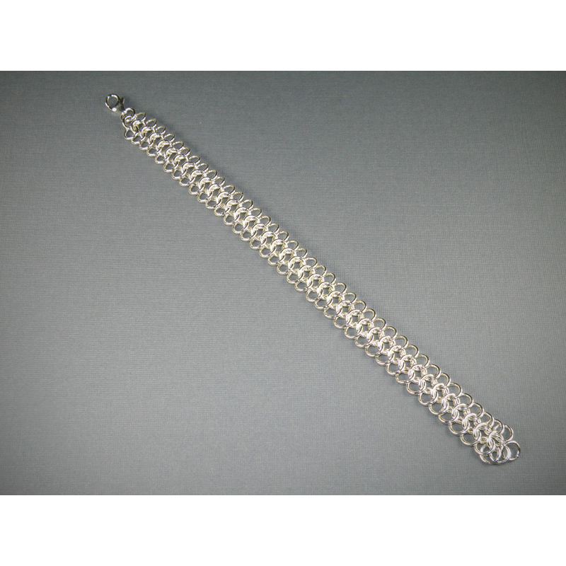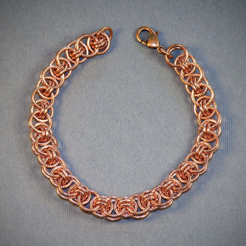 Chainmaille begins as straight wire. It is coiled over a mandrel to a specific diameter. The coils are then cut apart to create individual jump rings. These rings are then woven into a desired pattern. When the piece is finished it is then tumbled for two hours in a rock tumbler with steel shot and a burnishing compound liquid. This process both hardens the material and polishes it to a high luster finish.