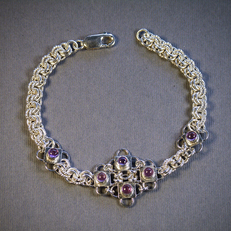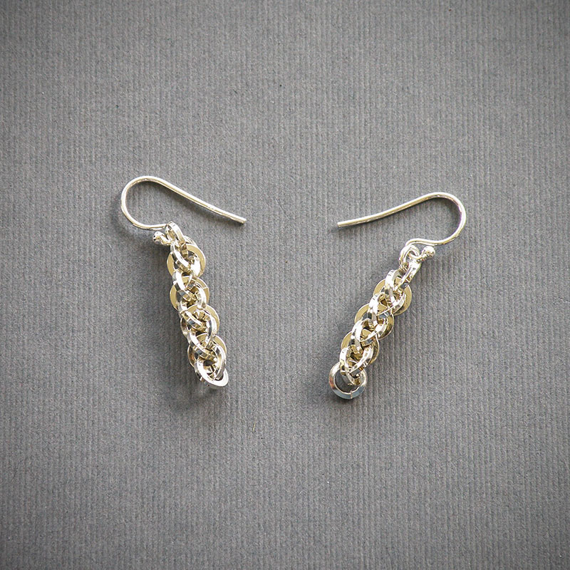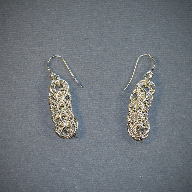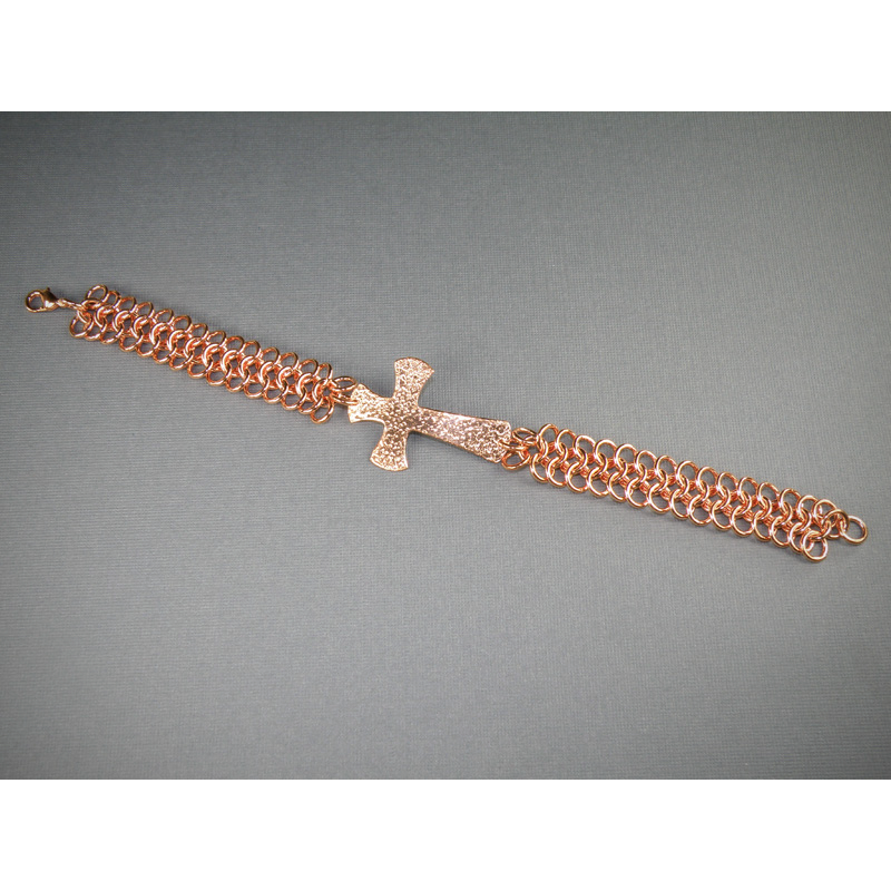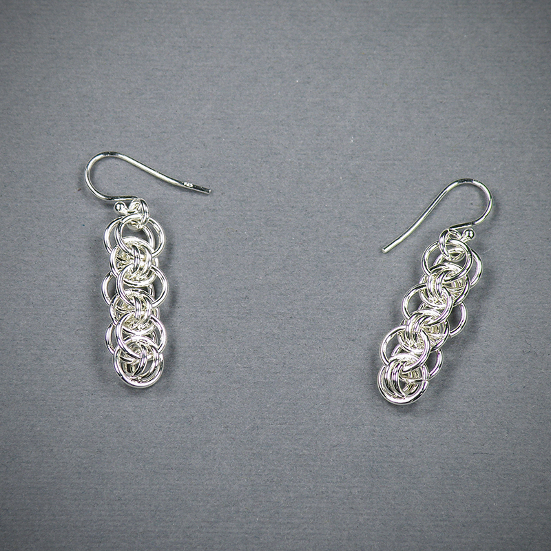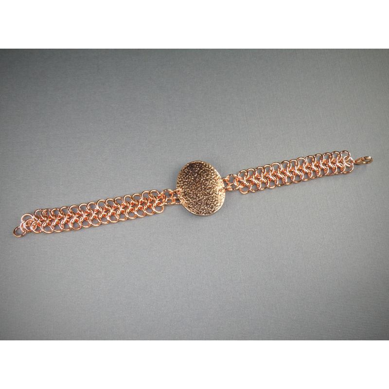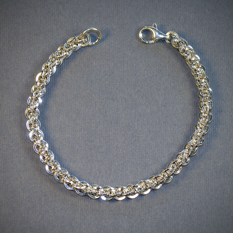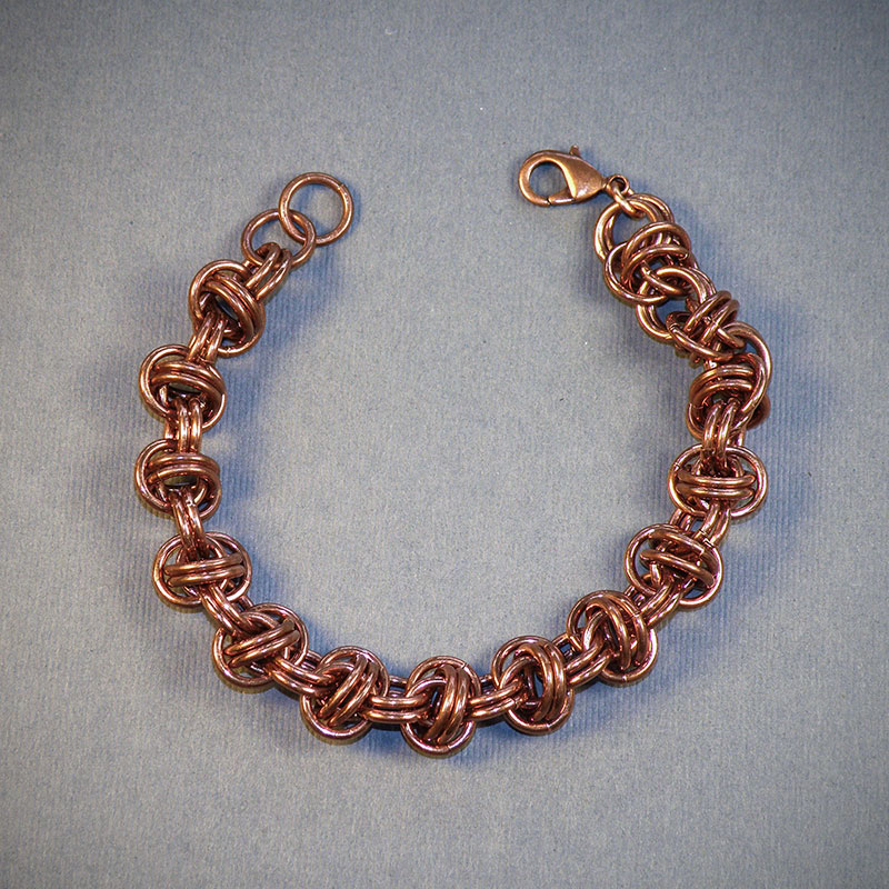 Chainmaille begins as straight wire. It is coiled over a mandrel to a specific diameter. The coils are then cut apart to create individual jump rings. These rings are then woven into a desired pattern. When the piece is finished it is then tumbled for two hours in a rock tumbler with steel shot and a burnishing compound liquid. This process both hardens the material and polishes it to a high luster finish.